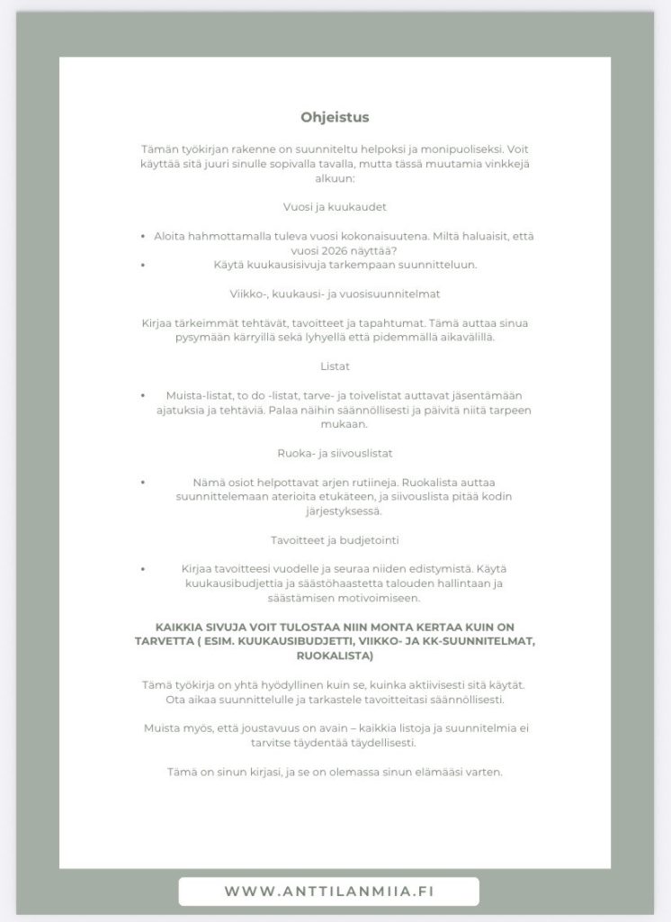 Toimivan arjen työkirja – Täytä ja toteuta on suunniteltu erityisesti sinulle joka arvostat käytännöllisiä, selkeitä ja monipuolisia työkaluja arjen organisointiin. Tämä 35 sivuinen tulostettava itse täytettävä työkalu yhdistää perinteisen kalenterin, budjetointivihkon ja arjen suunnittelijan yhteen kokonaisuuteen, jota voit hyödyntää yhä uudelleen.
