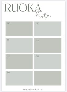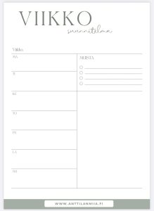 - Viikko-ohjelma: ruokalista, siivouslista ja tehtävälista pitävät viikon järjestyksessä